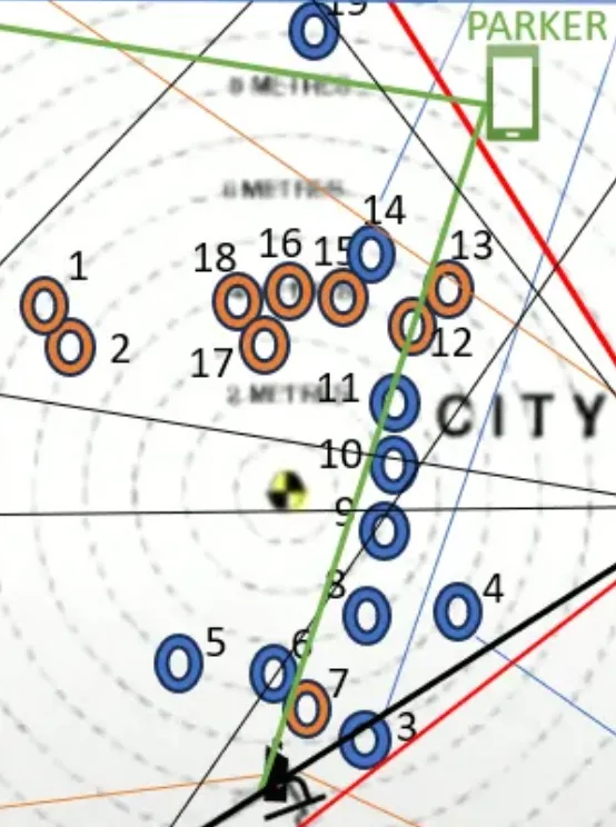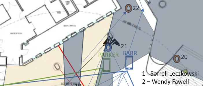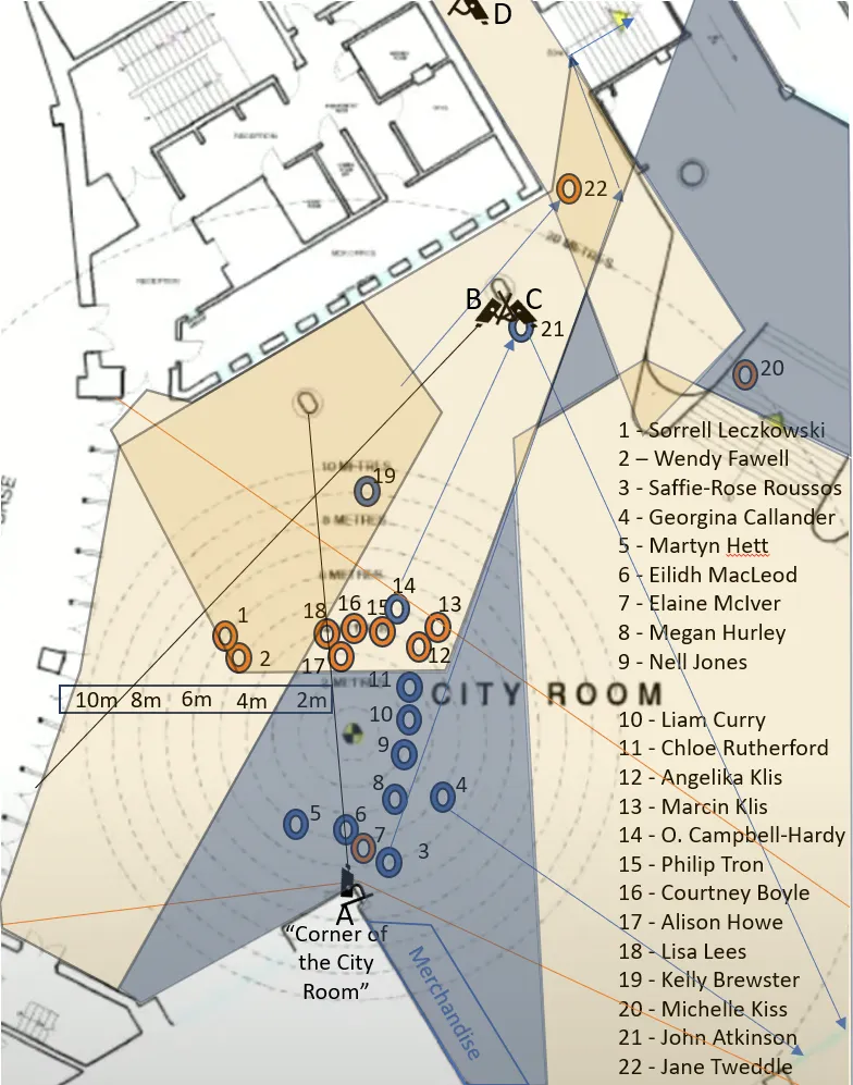 I have plotted on the diagram below where I think each of the three camera phones was approximately located at the time the evidence was recorded. Please note that this diagram was updated on February 25, 2025, to reflect the information about Michael Buckley below.