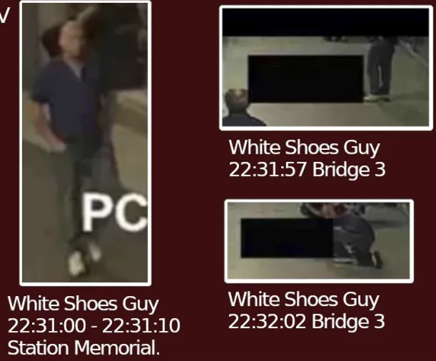 Pighooey observes that the same man seen above, wearing white shoes, is also visible on three pieces of CCTV imagery as he enters the train station and goes up the footbridge following the bang: