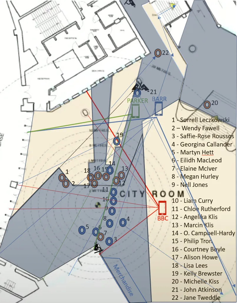 Nevertheless, the State broadcaster, the BBC, in November 2022 did offer up a diagram of named victims, supposedly based on the Inquiry, which proves broadly compatible with Operation Manteline’s placement of victims from seat of blast, as well as Operation Manteline’s CCTV redactions and evidence based on a member of the public allegedly filming at 22:31. The surprising coherence between those various sources suggests that either the official version of events is true, or else there was a rigorously thought out master narrative on the part of the State.
