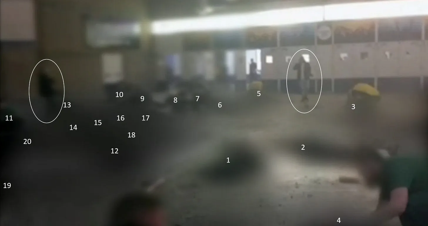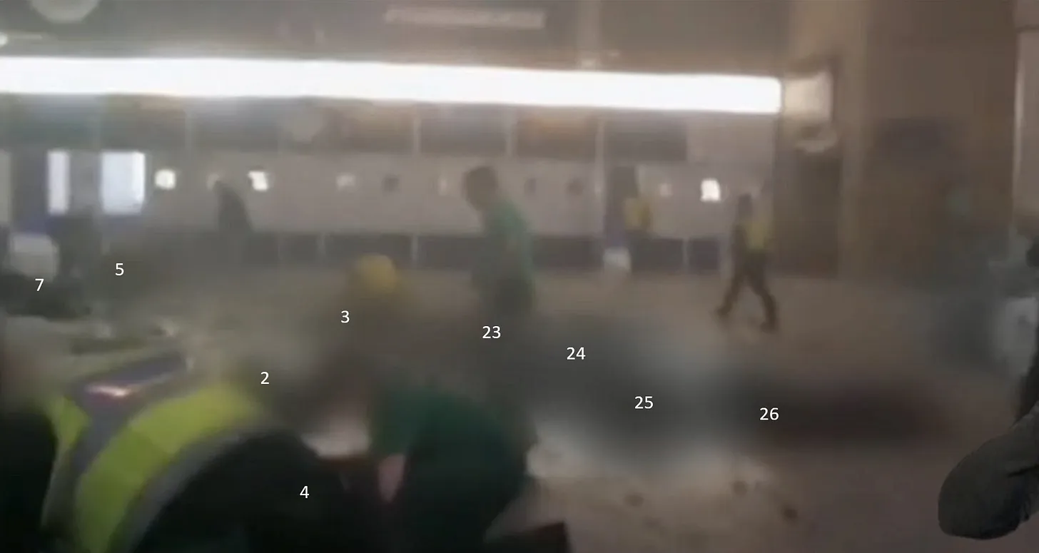 We can infer from Hall’s post-detonation composite image that most of the floor space to the left of the Barr footage did not contain any fatalities, so the total count remains at 34. There is no sign of blood on the floor from any evacuee.