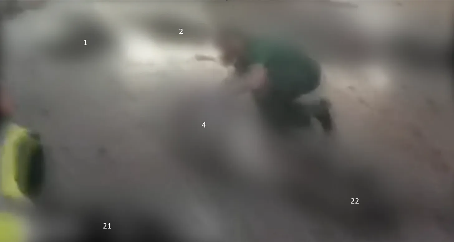 What Davis here labels 2 and 3 probably correspond to what I have labelled 19 and 20 in the BBC footage. If so, only one more victim is to be added, taking the total count to 33. An additional victim in the foreground (17) takes the count to 34. Otherwise, the entire floor space from the camera phone location to victims already accounted for is empty, and there are no signs of any victims to the left.